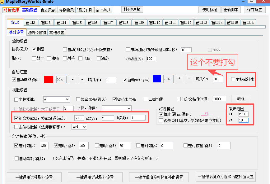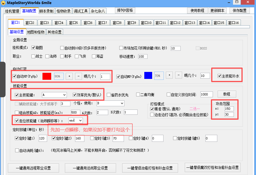 (1)补血技能放到A,药水放到pageup,打勾牧师主技能补血! (攻击范围x:150 y:30)