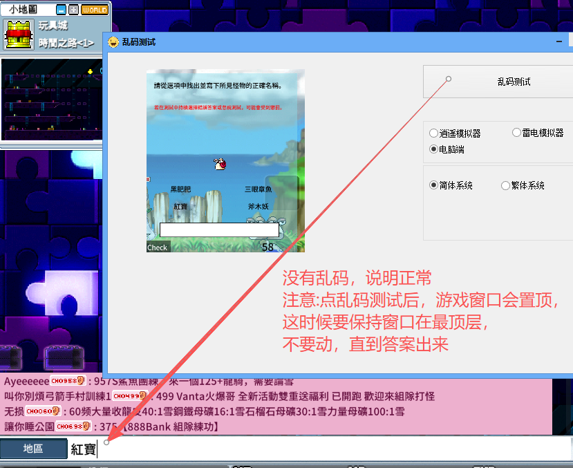依次选择游戏平台、电脑系统字体类型、然后点击乱码测试即可
