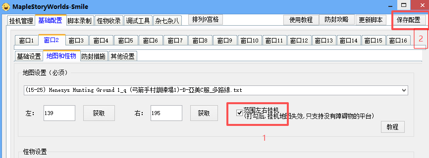 (6)走回平台中间,打勾范围左右挂机,并保存配置(切记走到平台中间再打勾启动脚本开始挂机)