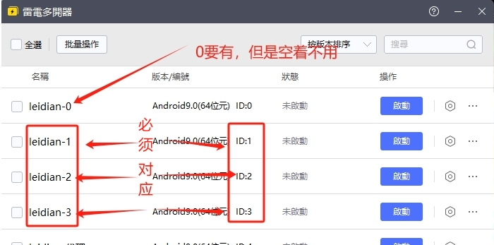 注意:模拟器标题和名称按下图所示设置,按顺序,偏号和ID数字要对应