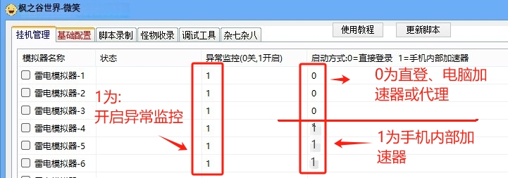 (异常包括:换线卡住异常、掉线异常、小地图卡死异常,创建组队异常,超时将结束游戏从开,所以需要配合自动登录,如果不需要,可都设置为0)