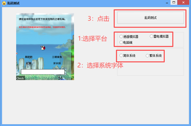 依次选择游戏平台、电脑系统字体类型、然后点击乱码测试即可